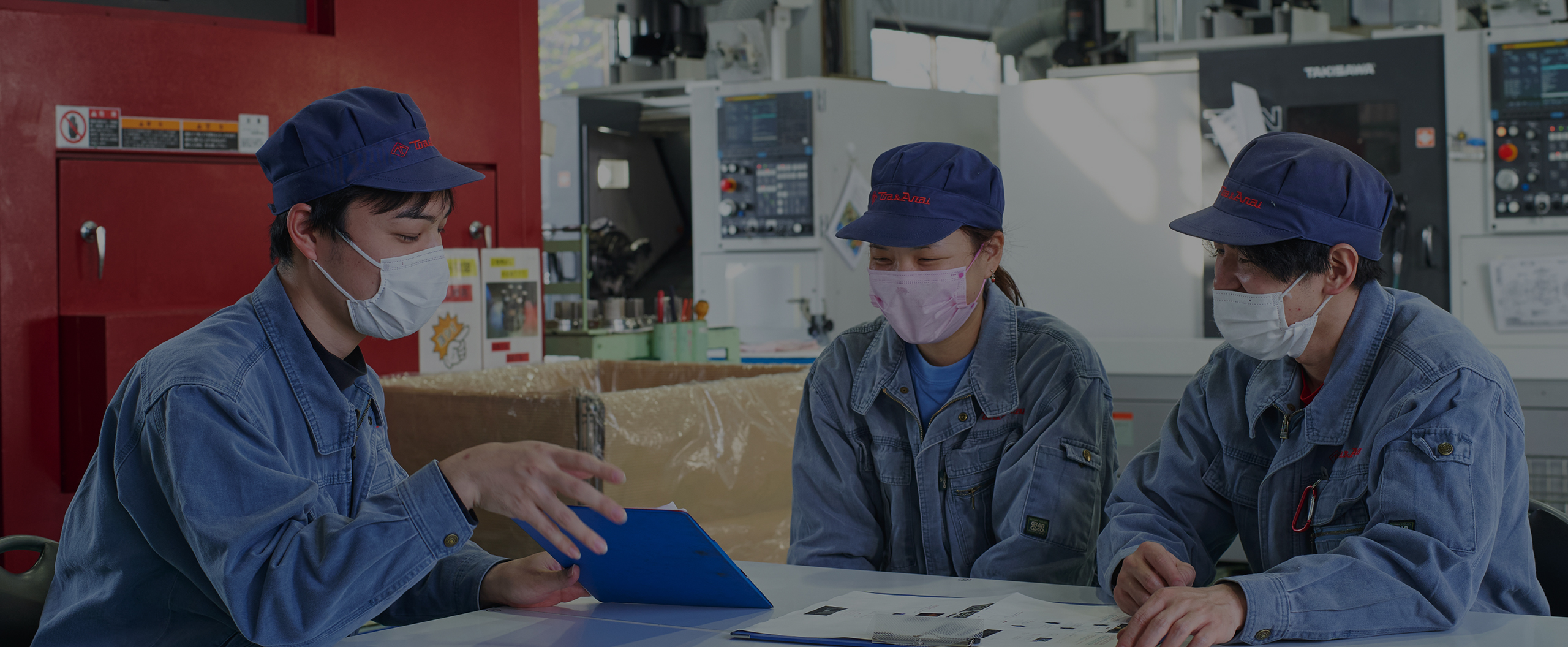 当社の強みは、お客さまの高いニーズに応えることです。「図面がないけど、量産して欲しい」「4つの部品を組み合わせたけど、一体型でできないか?」「今まで納期が2週間だったが、3日で仕上げて欲しい」等々。それらを「やってやろうじゃないか」という気概でスタッフ一丸となって進めていくのですが、その時に重要なのは、スタッフ間での「コミュニケーション」です。お客さまのニーズにお応えするためには、高度な技術はもちろんですが、普段からスタッフ間でしっかりとコミュニケーションができていないと、そもそも成立しません。前向きで、気さくで明るく、積極的にコミュニケーションを取ろうとする人がいいですね。(服部部長)